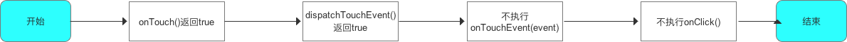 onTouch()返回true(该事件被onTouch()消费掉) = dispatchTouchEvent()返回true(不会再继续向下传递) = 不会执行onTouchEvent() = 不会执行OnClick()