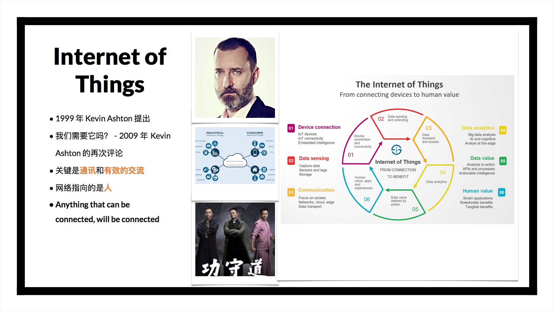 其实 IoT,Internet of Things 这个词就是 Kevin Ashton 在 1999 年的一次演讲中提出的,那时候的目的还是为了将供应链和方兴未艾的互联网结合起来。十年之后,在 2009 年他又一次阐述了自己对于物联网的看法:在那个时候,互联网的基础建设已经非常完善。电脑与电脑的连接,通过路由器,通过各类协议相互连接以及交换由人类及人类社会产生的信息。这张巨大的网络已经铺满了整个世界,中间有数不清的节点,可是却漏掉了一个环节 —— 人。可是人偏偏是不擅长消化这些存在于数字领域的信息的,我们看不懂任何一个字节,更不能以它们为食。物联网的存在就是为了解决这里的矛盾,在把人纳入这个信息网络的同时,尽可能地去解放人的时间和精力,让信息的传递更有效率。IoT 概念里有一句话叫「Anything that can be connected, will be connected.」,其实你和我也在这其中。