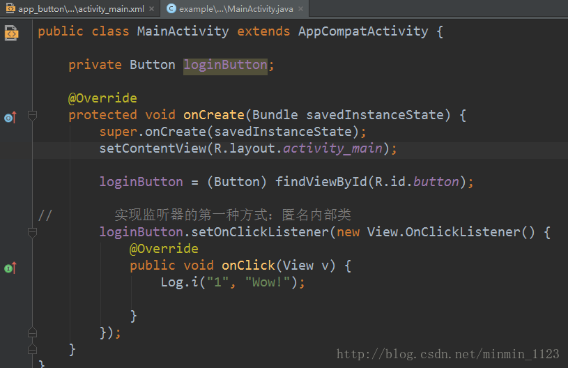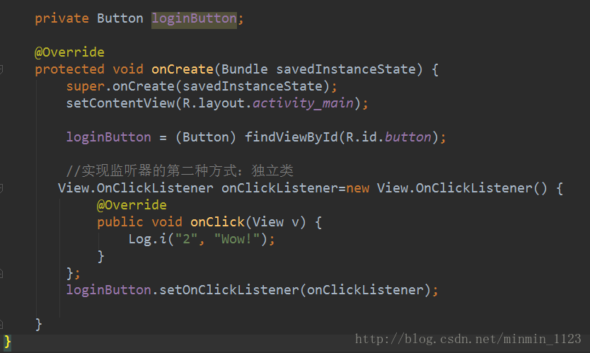 Button的监听器是OnClickListener,如何注册点击事件呢?首先在Mainactivity中对声明一个Button对象并绑定数据,然后用setOnClickListener方法给它安上监听器,这里需要一个OnClickListener对象的参数,实现方式有以下三种方法: