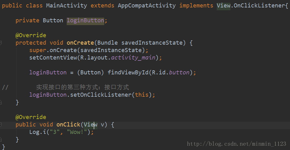 继承监听接口要在MainActivity类内重写方法onClick,此时用this就可以实现监听器的作用。