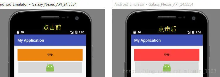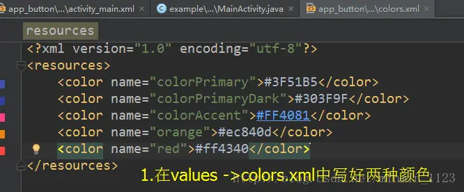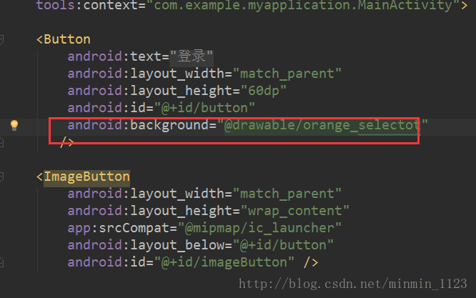 在环境篇介绍过drawable和mipmap系列文件夹都存放图片资源,在src和backgroud可通 过 @drawable/ 或 @mipmap/ 显示系统提供的图片,也可以将系统外的图片拖进上述文件夹里,这和用@string/显示文本的功能是一致的。观察上面的两个按钮,它们默认底色是灰色,被点击之后有轻微的效果,现在要把Button改成底色为橘色点击后闪现红色的按钮,下面通过改变按钮的样式的这个小例子介绍如何用drawable实现自定义图像。