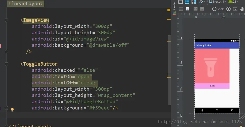 ToggleButton是开关按钮,它有两种状态:选中和未选择状态。比如使用手机的手电筒,有开和关两种状态,分别对应不同的图标。ToggleButton有几个常用的属性:android:checked(当前按钮的状态,true表示当前处于选中状态,false表示未选中也是默认状态)、 android:textOn (当被选中时按钮上的文本内容)、android:textOff(当未被选中时按钮上的文本内容)。现在下图这个布局就很容易理解了(我事先在drawable下放入了两张图标):