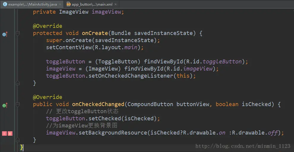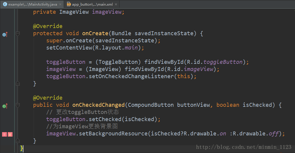 那么如何让图标和按钮同时变化呢?就需要ToggleButton的监听器OnCheckedChangeListener了。当选中ToggleButton时,触发onCheckedChanged事件并会返回一个布尔类型的参数ischecked,利用ischecked可以改变ToggleButton的选中状态从而改变ToggleButton显示的文本内容,还可以改变ImageView显示的背景图标。