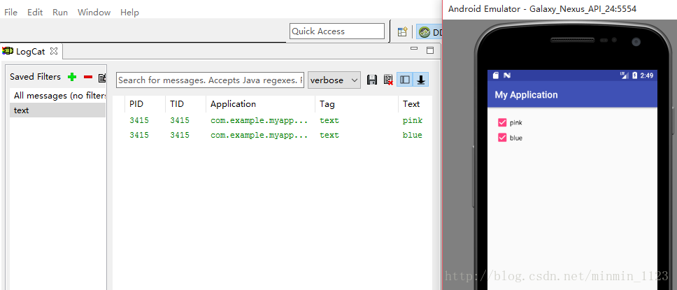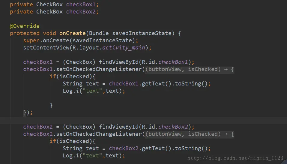 用Log日志进行调试代码如下,我们希望在日志文件显示出被选中的CheckBox上的文本内容,先用getText()方法拿到复选框上的文本信息再通过toString()方法转换成string类型,就能实现了。