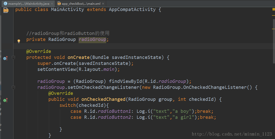 RadioGroup的监听器也是OnCheckedChangeListener,它们都和选中改变状态有关。关于OnCheckedChangeListener监听器也介绍了许多,相信大家一定能理解下图的代码含义了!