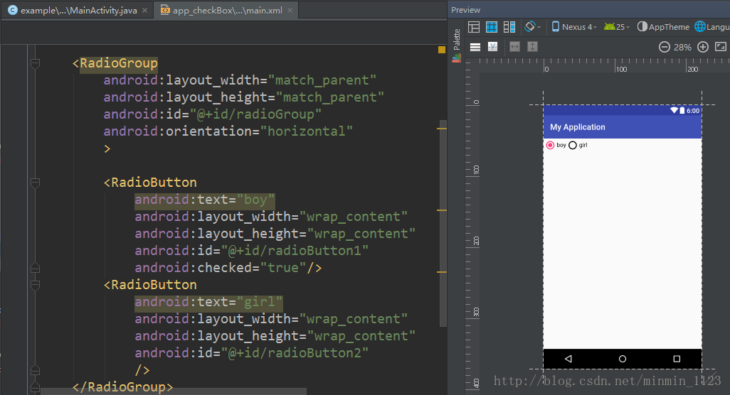 RadioButton也有选中和未选中的两个状态,但它和复选框CheckBox的区别是它选中后再点击不能改变状态,这有什么用处呢?其实RadioButton常常构成一个集合以RadioGroup的形式为我们所用,比如一道多选一的选择题,每组RadioGroup里只能有一个RadioButton被选中,如果想改变此时被选中的RadioButton的状态,只能通过选中其他RadioButton来实现。RadioGroup有个常用的属性:android:orientation(表示包含的RadioButton的排列方式,horizontal表示水平排列,vertical表示垂直排列)。