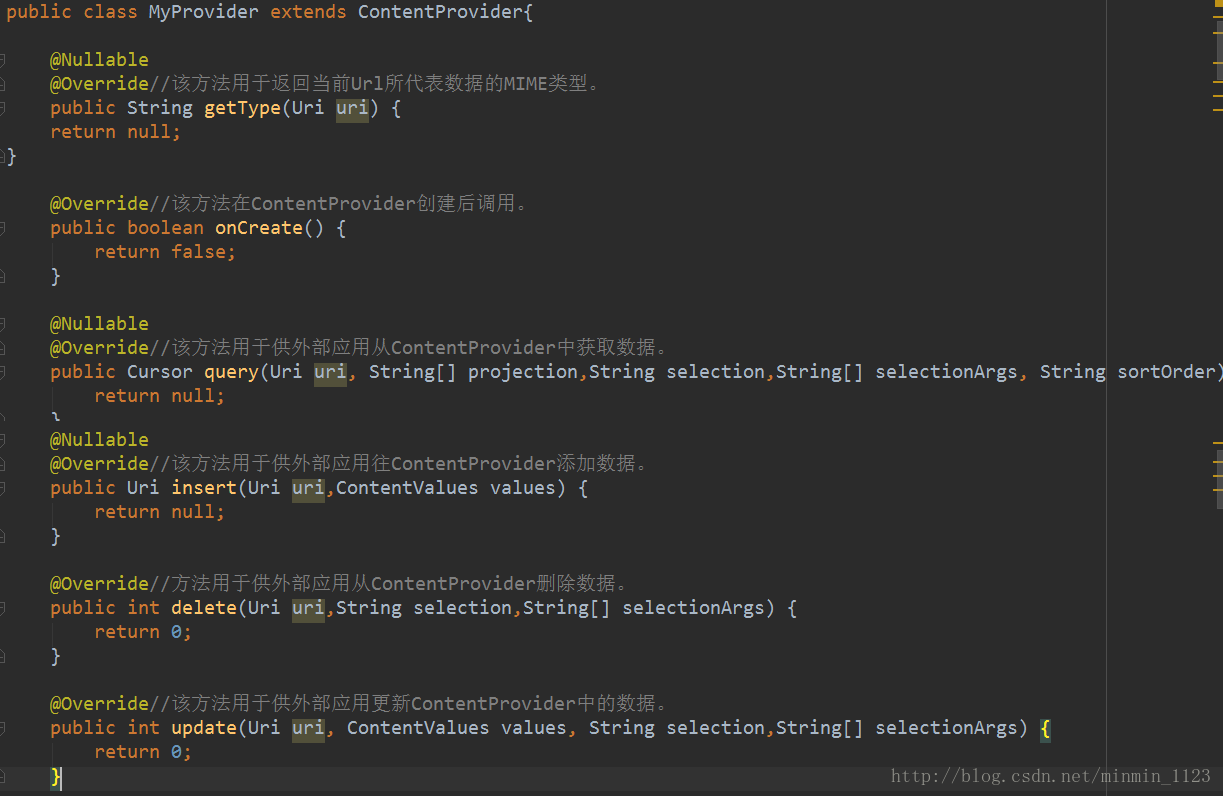步骤二:重写ContentProvider的六个抽象方法,方法及含义如图: