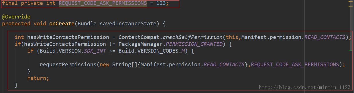 final private int REQUEST_CODE_ASK_PERMISSIONS = 123;