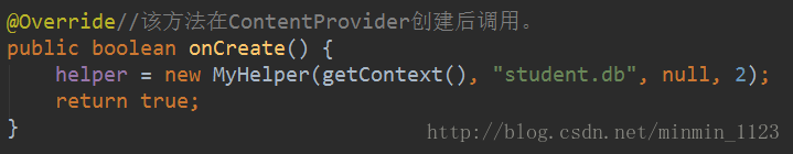 接下来就是六个抽象方法的具体实现了,先看onCreate()方法,这里创建了一个MyHelper的实例,然后返回true表示内容提供器初始化成功,现在数据库就已经完成了创建或升级操作。