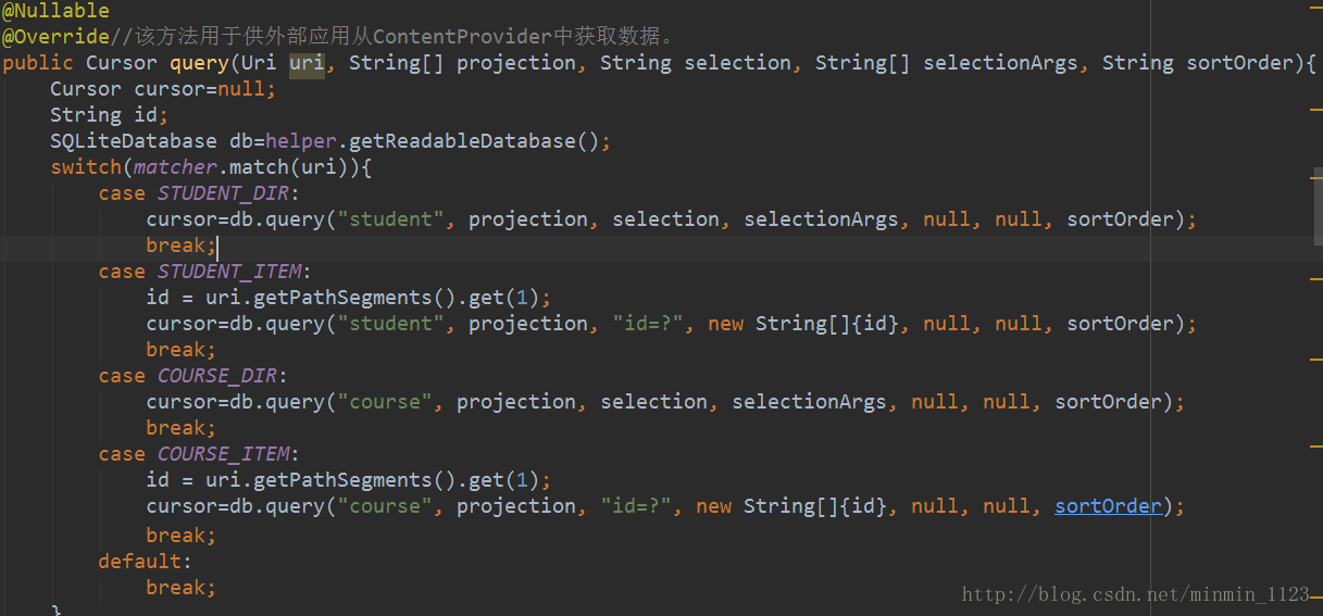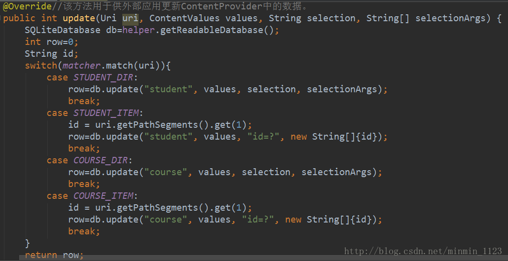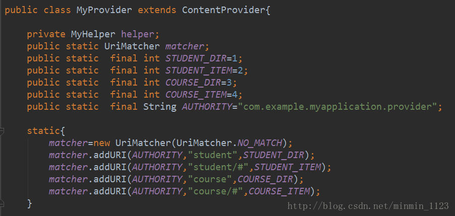 然后开始自定义提供器吧!一开始定义了四个常量,分别表示访问student表中的所有数据、访问student表中的单条数据(student/#用于表示student表中任意一行记录)、访问course表中的所有数据和访问course表中的单条数据。然后在静态代码块里对UriMatcher进行了初始化操作,将期望匹配的几种URI格式添加了进去。