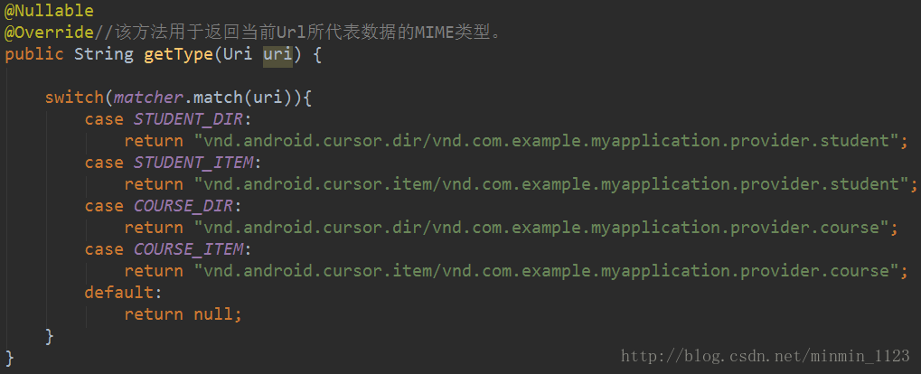 接下来是 getType()方法,需要返回一个MIME字符串。一个内容URI所对应的MIME字符串主要由三部分组分,Android对这三个部分做了以下格式规定:必须以vnd开头;如果内容URI以路径结尾,则后接android.cursor.dir/,如果内容URI以id结尾,则后接android.cursor.item/;最后接上vnd.< authority>.< path>。所以四个内容URI对应的MIME字符串分别是: