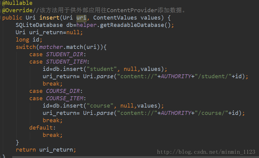 再看insert()方法,同样的,先获取到SQLiteDatabase的实例,然后根据传入的Uri参数判断出用户想要往哪张表里添加数据,再调用SQLiteDatabase的insert()方法进行添加就可以了。注意insert()方法要求返回一个能够表示这条新增数据的 URI,所以还需要调用Uri.parse()方法将一个以新增数据的id结尾的内容URI解析成Uri对象。