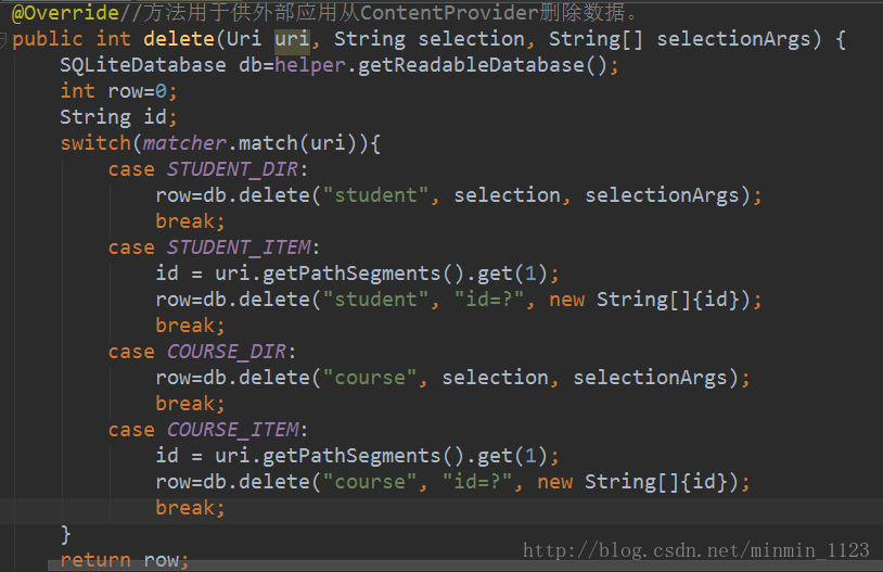 再来看delete()方法,和前面一样的,不同的是这里需要在调用SQLiteDatabase的delete()方法删除特定记录的同时还要把被删除的行数作为返回值返回。
