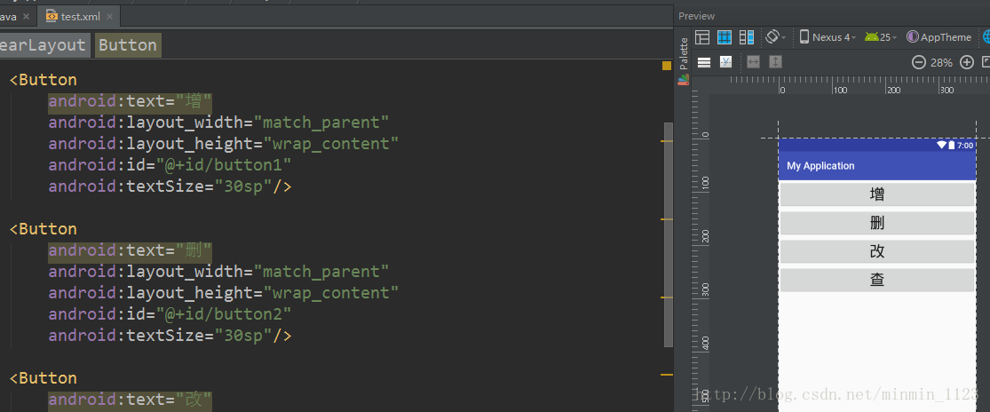 现在需要做的是将该程序从模拟器中卸载防止之前产生的遗留数据对后面操作有干扰,然后再运行一下重新安装在模拟器上,启动后直接关闭掉。接下来创建一个新的module,注意包要不同,代表其他程序。新建一个布局test.xml并放四个按钮:
