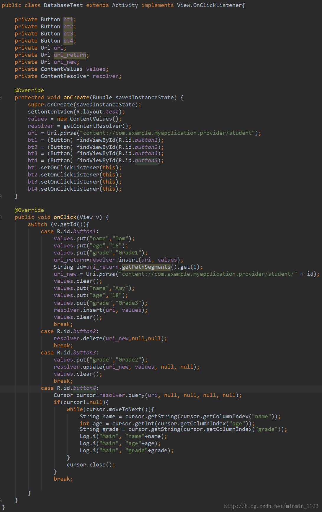 接下来在活动分别处理四个按钮的点击事件。到目前为止这是第三次用增删改出方法去操作数据了,相信这些代码已经不难理解了!调用Uri.parse()将一个内容URI解析成Uri对象,这里希望操作student.db中的student表。又获取到ContentResolver对象就可以进行CRUD操作了,这里插入两条记录,并且通过第一条记录的insert()方法得到一个Uri对象,这个对象中包含了新增记录的id,调用getPathSegments()方法将它取出,之后利用这个id合成新的内容URI和Uri对象方便给该条记录进行更改和删除的操作。查询操作完成的打印出表中所有的数据。