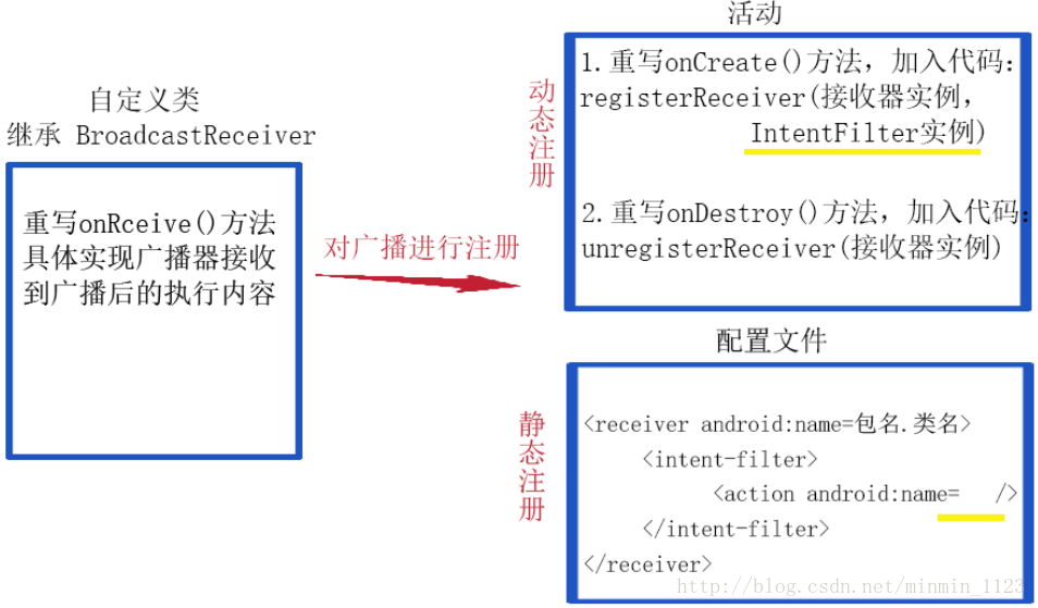 第二步:对广播接收器进行注册。有两种注册方法:一种在活动里通过代码 动态注册 ,另一种在配置文件里 静态注册 。其实仔细观察,两种方式都是完成了对接收器以及它能接收的广播值这两个值的定义。这两种注册方法一个区别是:动态注册的接收器必须要在程序启动之后才能接收到广播,而静态注册的接收器即便程序未启动也能接收到广播,比如想接收到手机开机完成后系统发出的广播就只能用静态注册了。