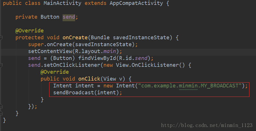 在这个按钮的点击事件完成发送一条值为com.example.minmin.MY_BROADCAST的广播。