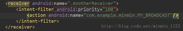 那如何让AnotherReceiver先接收到值为com.example.minmin.MY_BROADCAST的广播呢?只要在注册的时候设定它的优先级android:priority为100,数值越大优先级就越高,现在就能保证它一定会在MyReceiver之前收到广播。