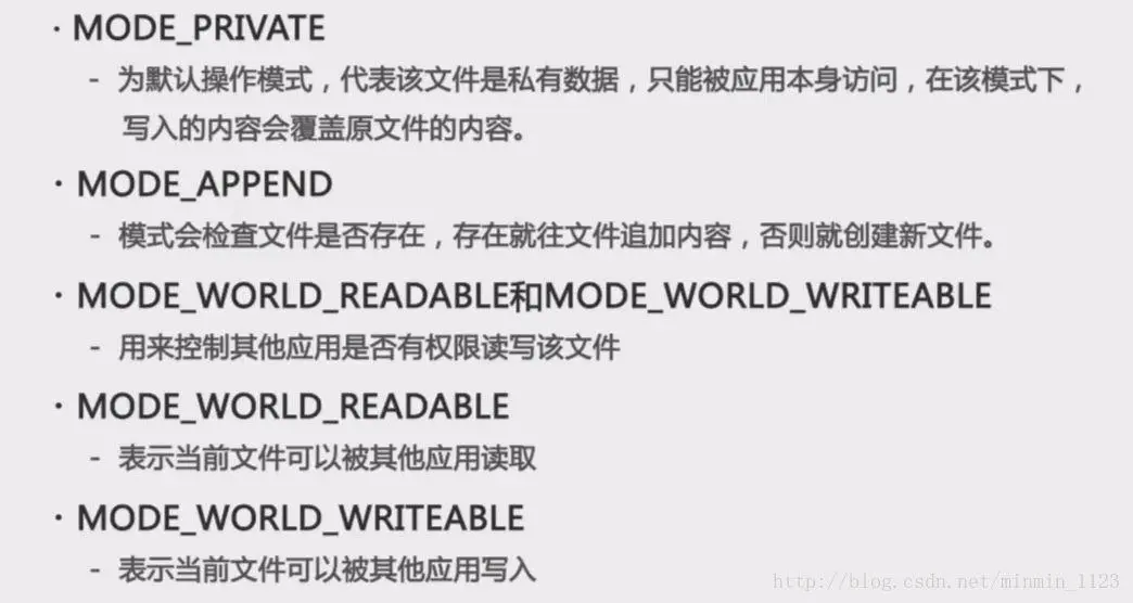 这里强调openFileOutput()方法里第两个参数,表示是文件的操作模式,常用的可选值含义见下图: