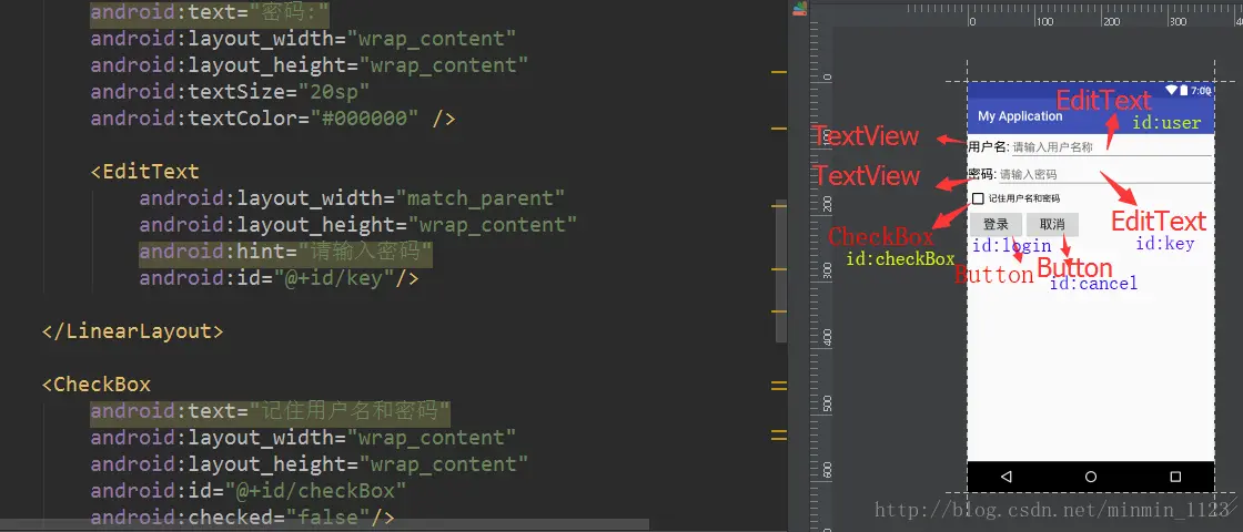 学习完SharePreferences基本知识点后,通过一个有记住密码功能的demo来巩固一下吧!新建login.xml,这里做一个登陆界面,如下图所示。相信这样的一个页面难不倒你,布局嵌套就能实现了。
