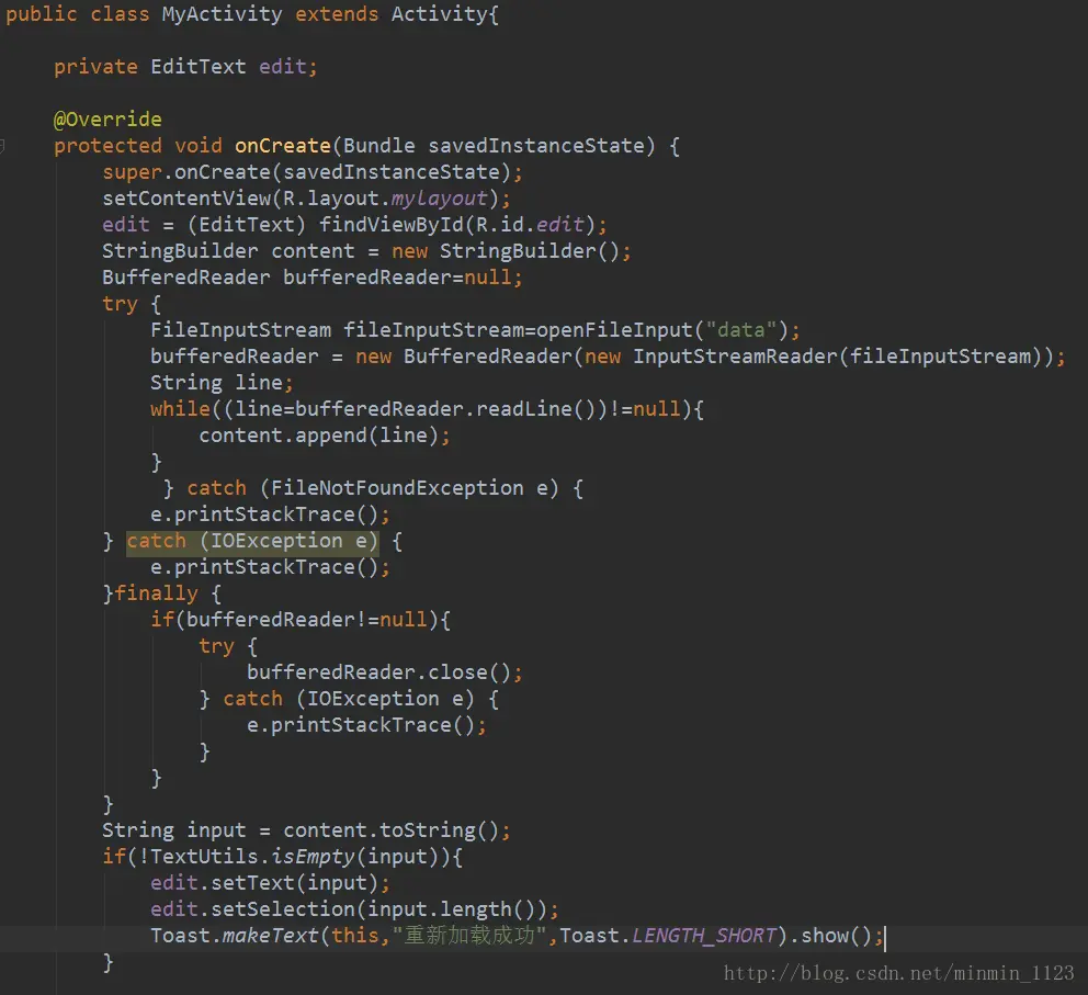 接下来我们想让程序再次启动时输入框内已经显示刚刚写入的数据。在OnCreate()中用* openFileInput()* 方法指定了要从文件data中读取数据,之后代码和写入是对应的非常好理解。读取到内容之后判断是否为空,若不为空,就set到EditText里,并调用setSelection 方法将输入光标移动到文本的末尾位置以便于继续输入,再弹出一句重新加载成功的提示。