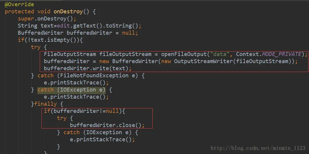新建MyActivity,在onCreate()获取EditText实例,然后重写onDestory()为了在活动销毁之前将输入的文本内容存储起来。具体方法是:先获取了EditText中输入的文本text,然后openFileOutput()方法将text存储到名为data的文件中并且能够得到一个FileOutputStream 对象,,再借助它构建出一 个OutputStreamWriter对象,接着再使用OutputStreamWriter 构建出一个 BufferedWriter 对象,这样就可以通过BufferedWriter来将文本内容写入到文件中了。