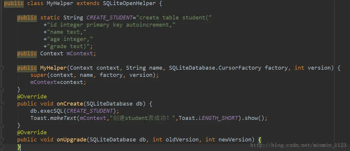 第一步:自定义帮助类并继承SQLiteOpenHelper,并重写两个方法:**onCreate()**和 onUpgrade(),分别在这两个方法中去实现创建、升级数据库的逻辑。还需要一个构造方法,这里用含有四个参数的构造方法就可以,如图: