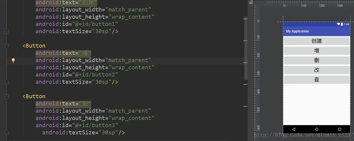然后新建布局,并放入五个按钮,对应创建和增删改查: