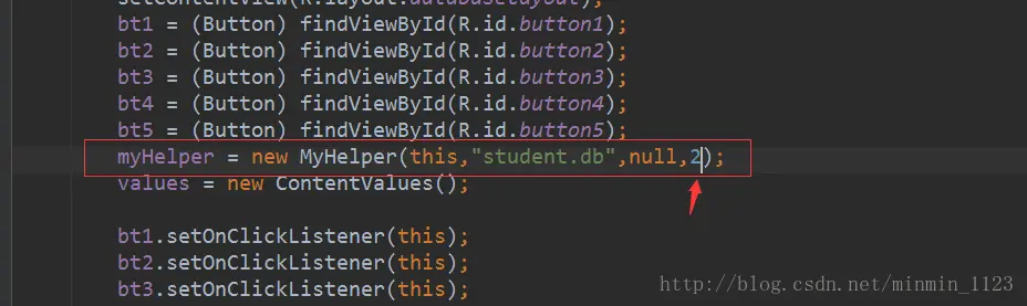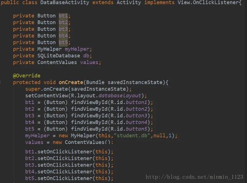 在主活动里获取所有按钮实例并注册点击事件,在onCreate()实例化帮助类MyHelper,指定数据库名为student.db,版本号为1。ContentValues类先跳过。