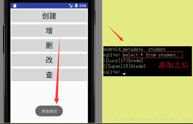 再来学习SQLiteDatabase用于增添数据的辅助性方法 insert() ,三个参数含义(被操作的表名,空值字段的名称,数据即ContentValues对象),第二个参数一般传入null。学会之后给student表插入两行记录吧,因为id这个属性设置了自增长所以可以不用管它: