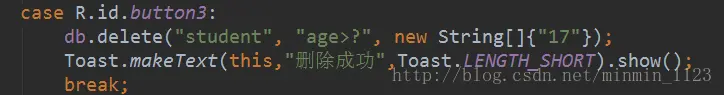 删除数据的辅助性方法是delete(),第一个参数还是表示表名,第二第三个参数用于约束删除某一行或几行的数据。比如需要删除student表中年龄大于17的记录: