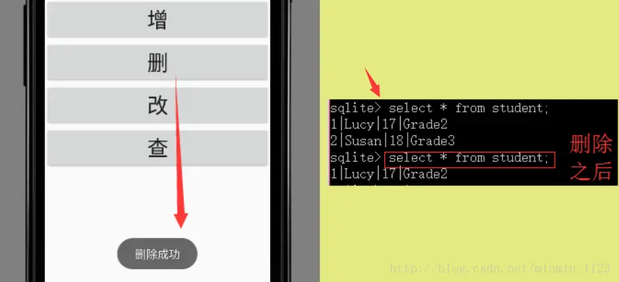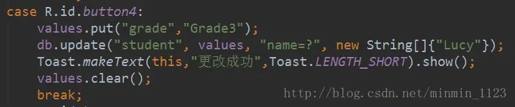 update() 方法提供四个参数,(表名,ContentValues对象,约束,约束),之前都学过了!来试试给表里唯一的学生Lucy的年级更改为高三: