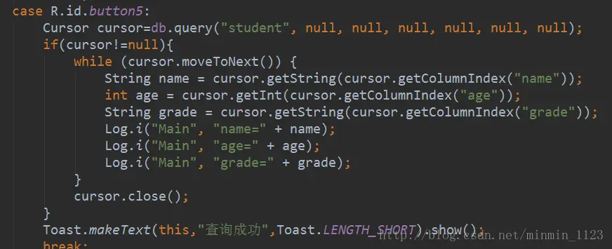 还没完,这个方法会返回一个Cursor,查询到的数据都会从它取出。Cursor常用方法: moveToFirst() 将指针移动到结果集的第一行; getColumnIndex() 获取某一列在表中对应位置的索引; get某某某() 传入索引以获取相应位置的某种类型的数据; close() 关闭指针。下面来查询student表中所有数据: