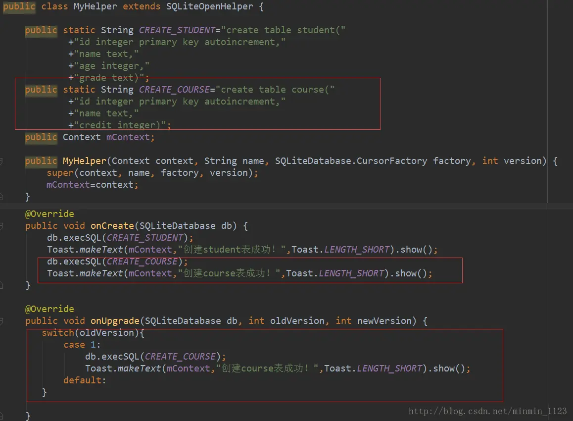MyHelper里需要重写的第二个方法 onUpdate() 用于帮助数据库进行版本更新。比如此刻需要在数据库再添加一张表course,只要在update()写好创建course的操作,然后想办法让它被调用就好了。还记得在实例化帮助类是需要传入的第四个参数版本号吗?之前的传入的是1,只要传入一个比1大的数就可以让update()执行了。在下图代码里利用了 oldVersion 去判断旧版本号,如果是1就只需要再建course表,如果初次运行程序,就只会执行onCreate()方法然后两张表就一起建立了。这样做的好处是无论更新到第几代都不会影响之前的操作数据,也能保证当前版本是最新的。