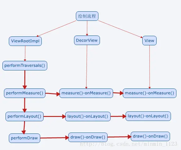 - 其中,performMeasure()会调用measure(),measure()中又调用onMeasure(),实现对其所有子元素的measure过程,这样就完成了一次measure过程;接着子元素会重复父容器的measure过程,如此反复至完成整个View树的遍历。layout和draw同理。过程图如下: