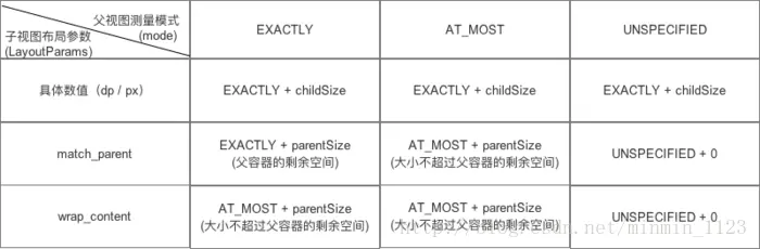 - 决定因素:值由子View的布局参数LayoutParams和父容器的MeasureSpec值共同决定。具体规则见下图: