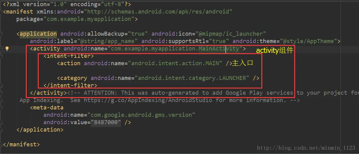 每在Android应用中添加一个Activity都必须在AndroidManifest.xml配置文件中声明, 否则系统将不识别也不执行该Activity。当application下有多个Activity,可用 intent-filter表示当前这个Activity是主页面。