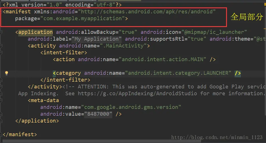 (1)全局部分:manifest是AndroidManifest.xml配置文件的根标签, 必须指定xlmns:android和package属性, 且只包含一个application节点。