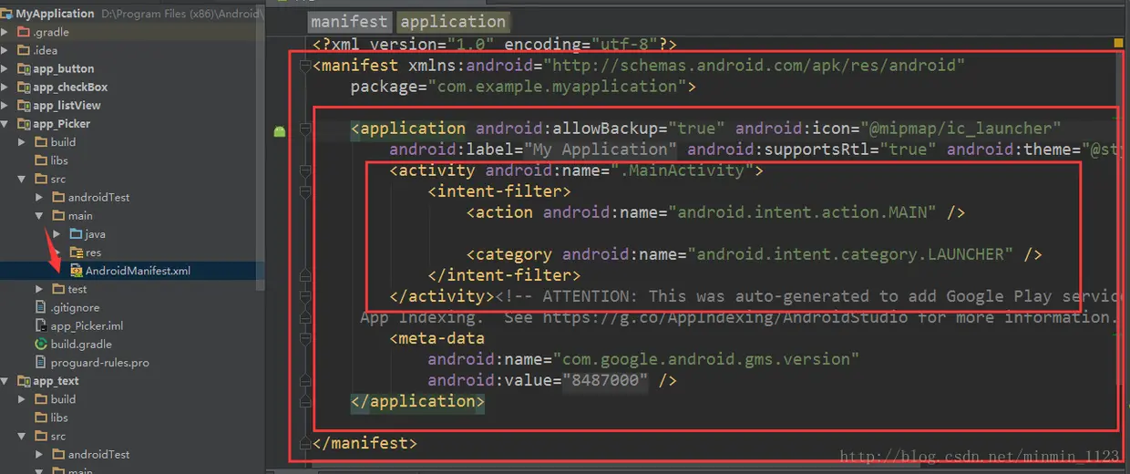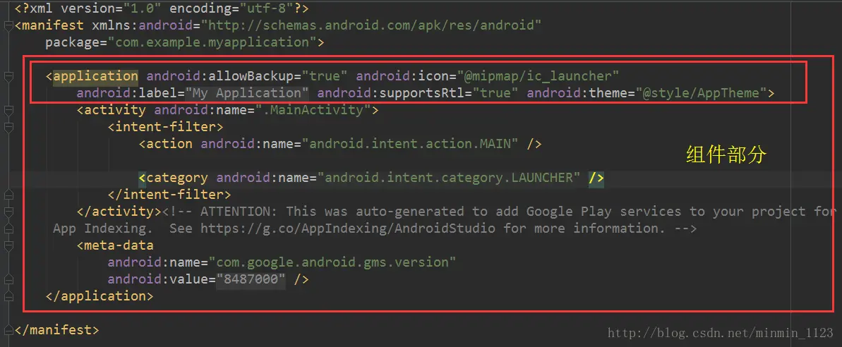 (2)组件部分:由一个application标签包裹着安卓四大组件。