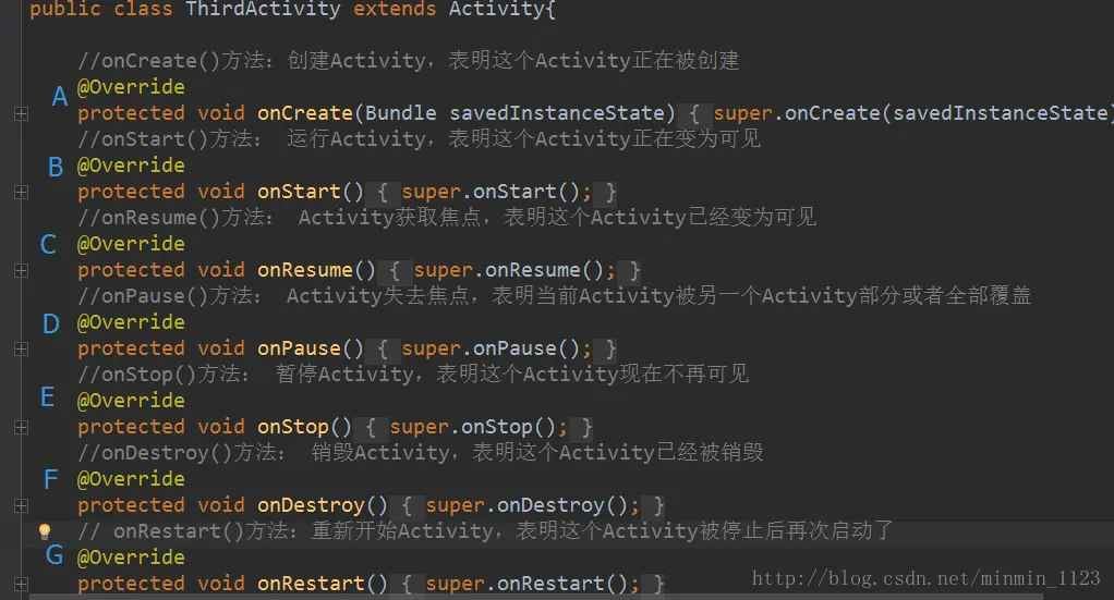 停止状态:Activity完全被遮挡,但此时还保留所有状态和成员信息。比如当按下Home键使得应用处于后台,这个过程调用方法D->E,应用处于暂停状态;当重新回到应用,这个过程调用方法G->B->C,使应用再次获得焦点。