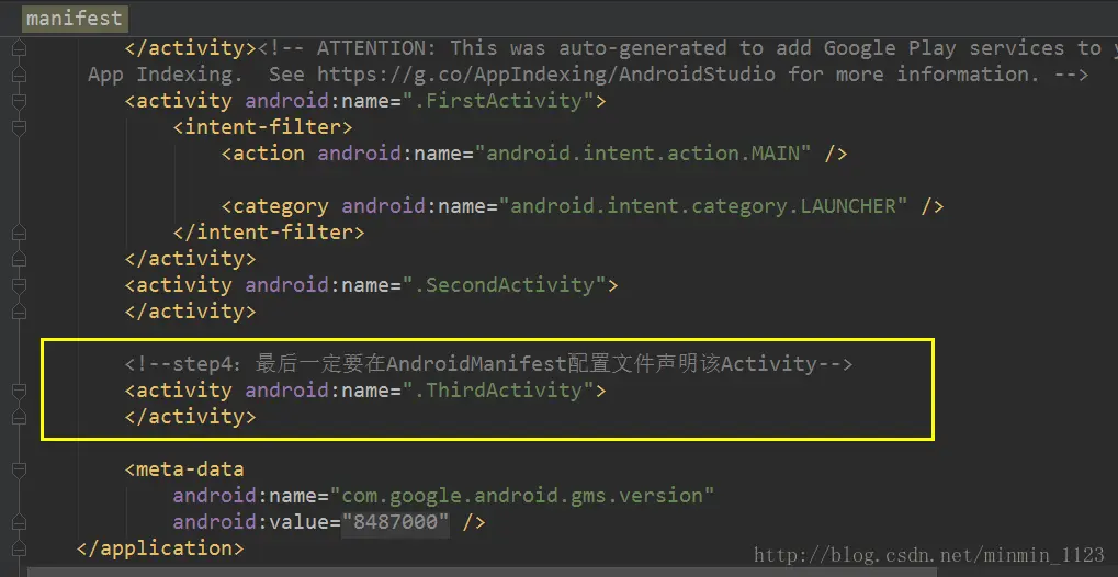 step4:最后一定要在AndroidManifest配置文件声明该Activity, 如果是主活动需要加上 intent-filter标签。