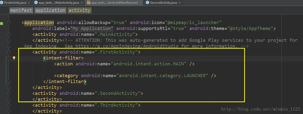 首先创建好两个Activity,注意在AndroidManifest给FirstActivity添加标签 intent-filter。