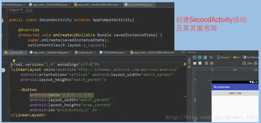 在简单了解配置文件和生命周期之后,接下来就可以用activity生命周期里一个重要方法—— onCreate() 实现如何创建一个Activity了。共四步: