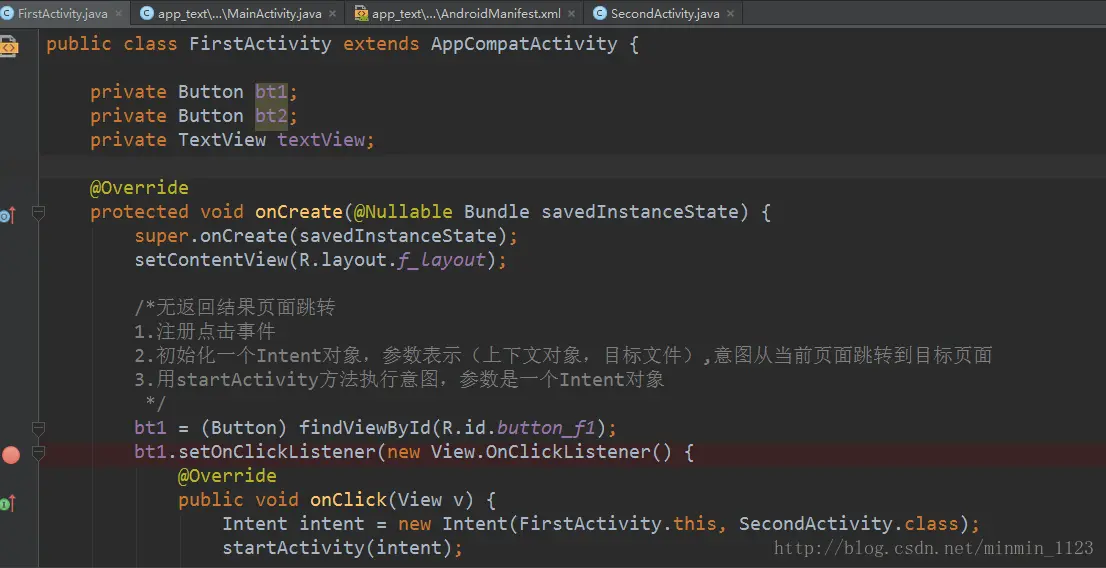 上述准备工作都完成后,Intent意图就可以开始它的表演了!在button点击事件里初始化一个Intent对象,并给予两个参数告诉Intent从哪个页面跳转到那个页面,需要注意的是如果用匿名内部类方式注册点击事件,初始化Intent时直接用this是访问不到当前activity的,两种可行办法:第一种办法用activity类名.this引用,第二种办法在方法外初始化一个全局变量并给它赋值this,这时引用该成员变量即可。最后用startActivity方法执行意图就完成了,具体代码和注解如下。