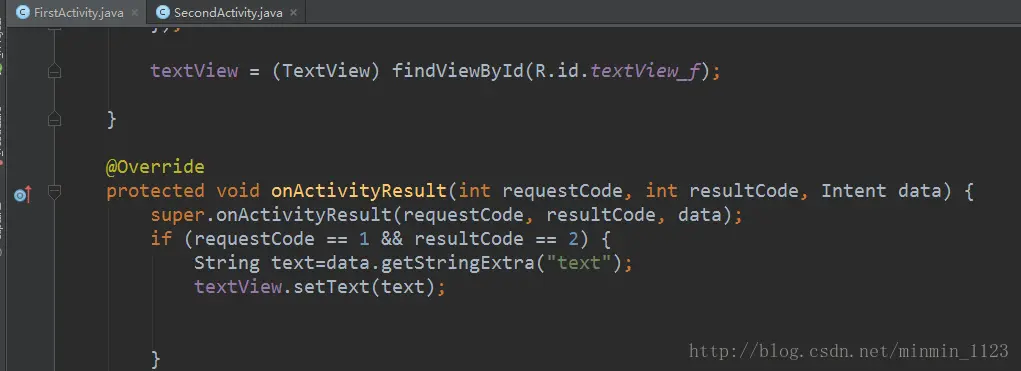 看到这里就验证了之前的预感是对的,能看到前面的精心准备——标号1,标号2还有从第二个页面传回的Intent对象都在这个方法里实现了自己的价值。其实也可以这样理解,onActivityResult这个方法里的参数resultcode,是方便当前FirstActivity活动判断哪个页面返回的消息,在复杂情况下返回的页面太多时,每个页面的唯一标号能更好的帮助它们辨识彼此。现在再回头看看那几个关键方法里的requestCode和resultCode是不是就理解了呢?