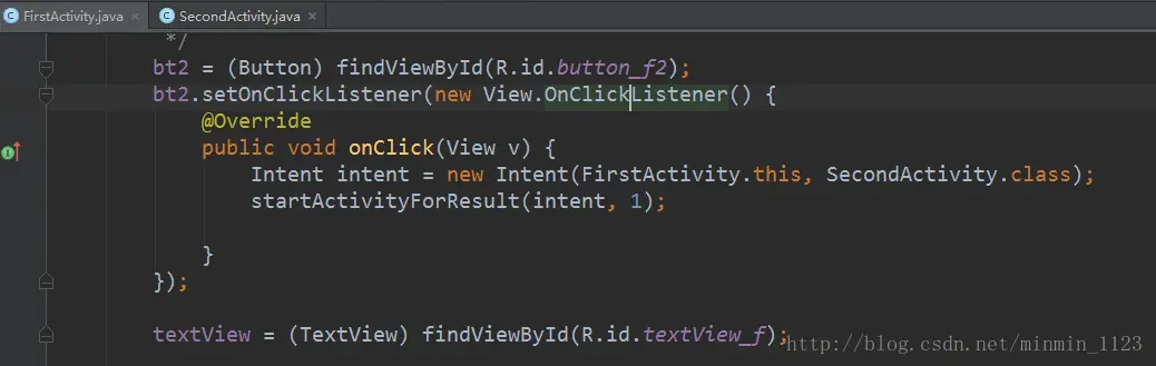 3)用方法startActivityForResult执行意图,参数表示(Intent对象,请求访问界面即主动方的int型标志)