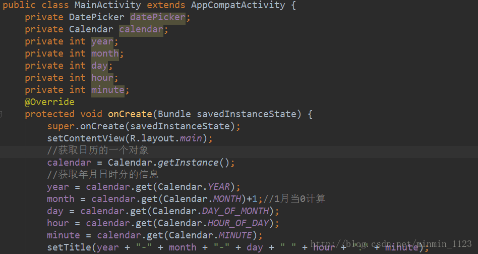 DataPicker想要注册监听器OnDateChangedListener,要通过它的一个方法init()并提供四个参数,前三个参数正是之前获取的年月日,表示初始时日历上所显示的日期,注意月份的计算和Calendar相同,所以不需要加1,第四个参数是监听器对象。触发事件后会返回被用户选择的年月日三个参数,再显示到标题上即可。
