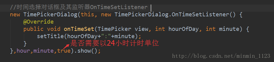 最后一个TimePickerDialog,学到现在,是不是能很容易掌握了?注册监听器OnTimeSetListener过程如下: