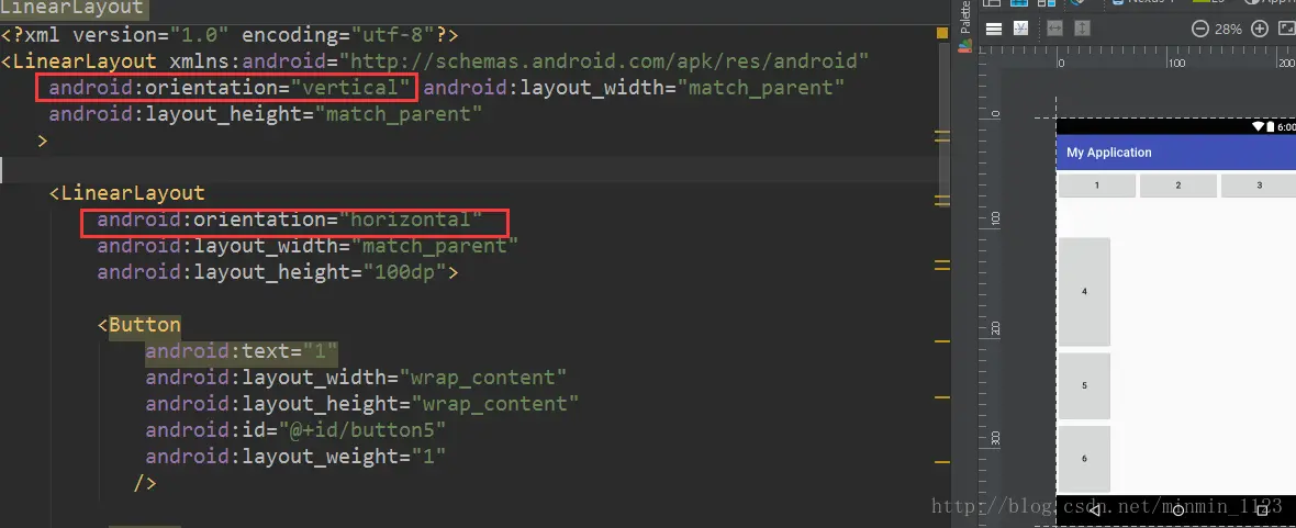从图中可以直观的看出,这个线性布局中的三个button是垂直排列的的,决定子控件的排布方向的属性就是android:orientation,它有两个选项,vertical表示垂直排列,horizontal表示水平排列,注意这个属性是在这整个LinearLayout标签之下的,是全局属性。