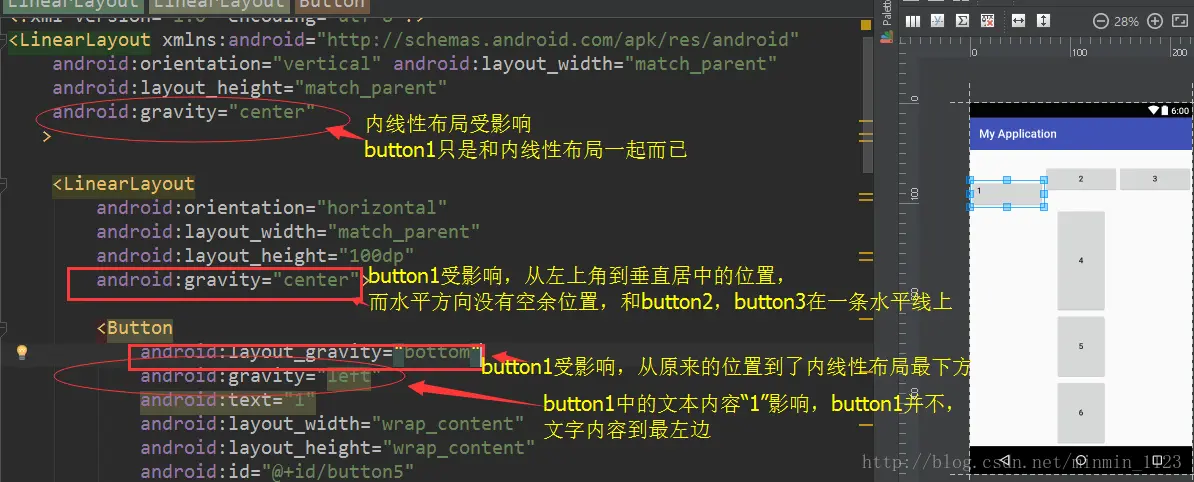 这两个属性很容易混淆,直观来看它们的差别是针对的对象不同。gravity是对它所有直接的子类的一个统一排布,子类的子类位置需要子类去统一排布,比如一个学校要上课间操,学校要求所有的学生以班级为单位都到操场的东南角活动,至于这个班级里所有学生是不是在班级活动区域的东南角学校管不着,班级要求全班同学那才可以。那如果这个班某个同学是体委,不和大家都去东南角活动,而是在西南角管理班级呢?这时要对体委用layout_gravity属性,layout_gravity针对的对象是使用这个属性的控件,控制这个控件相对于直接父容器的位置。那么下面这四行代码之后的button1位置是不是就很好理解了?